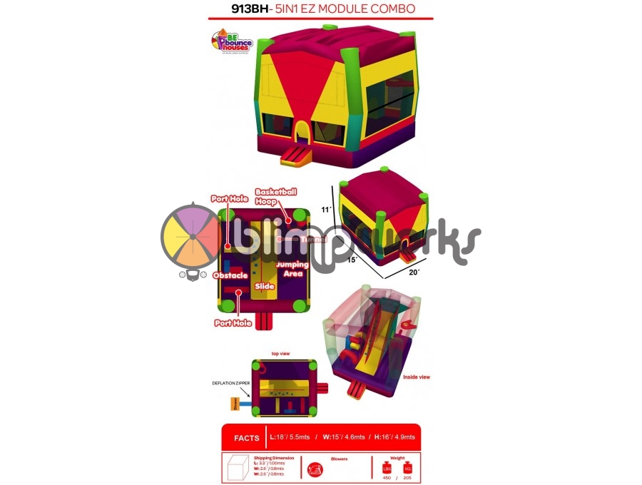 Only the Inflatable Depot can manage to combine five activities in the same game! This incredible combo includes pop-ups, a giant slide, a tunnel, a jumping area and a basketball hoop. You may even attach a banner across the top of the game.